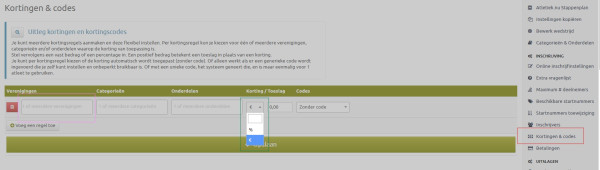 Dat doe je door in het rechtermenu te kiezen voor "kortingen en codes" (rode rechthoek). Vervolgens vul je de naam van je vereniging in (rose rechthoek) en kies je voor "%" en dan 100 (groene rechthoek). Op die manier geef je atleten van je eigen vereniging 100% korting.